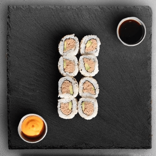 California tempura crevette concombre, oignons frits 8 pièces, california poulet pané, concombre, oignon frit 8 pièces, California thon cuit avocat 8 pièces.